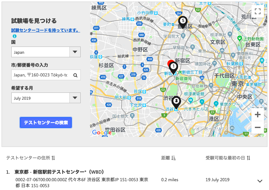 試験場所テストセンターの場合は、受験申し込みの際に以下のような感じで郵便番号を入力すると、最寄りのテストセンターが表示されます。